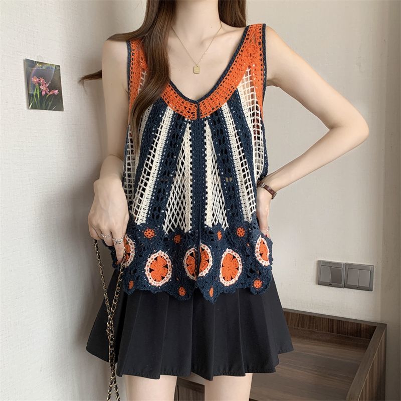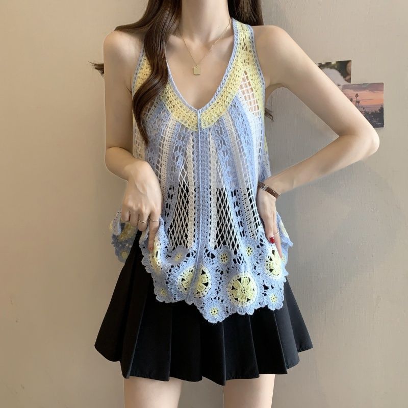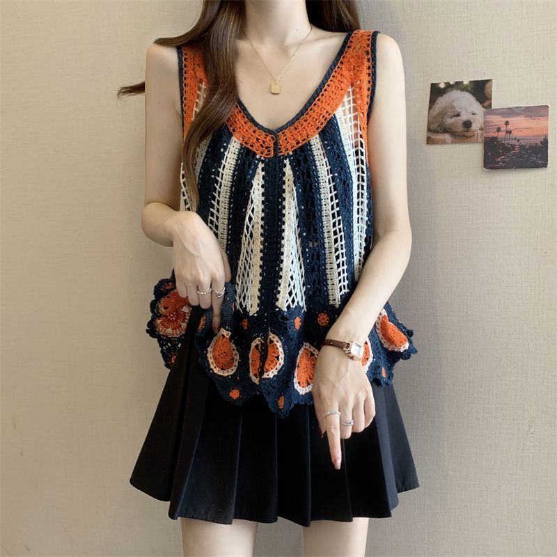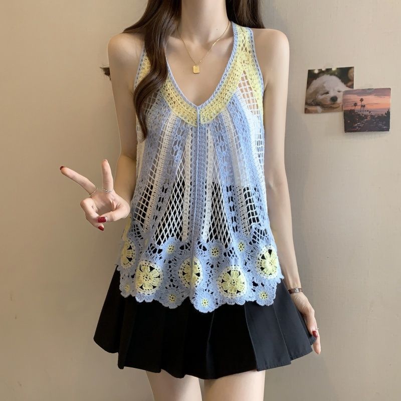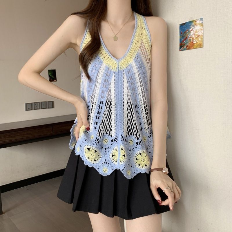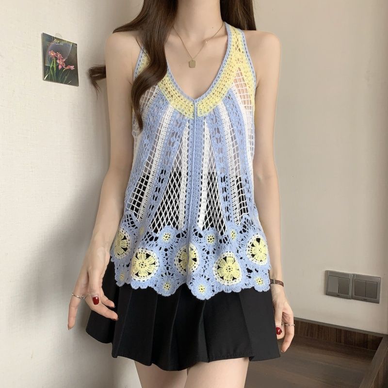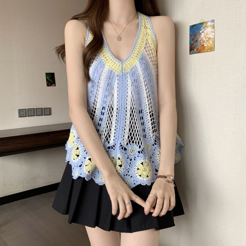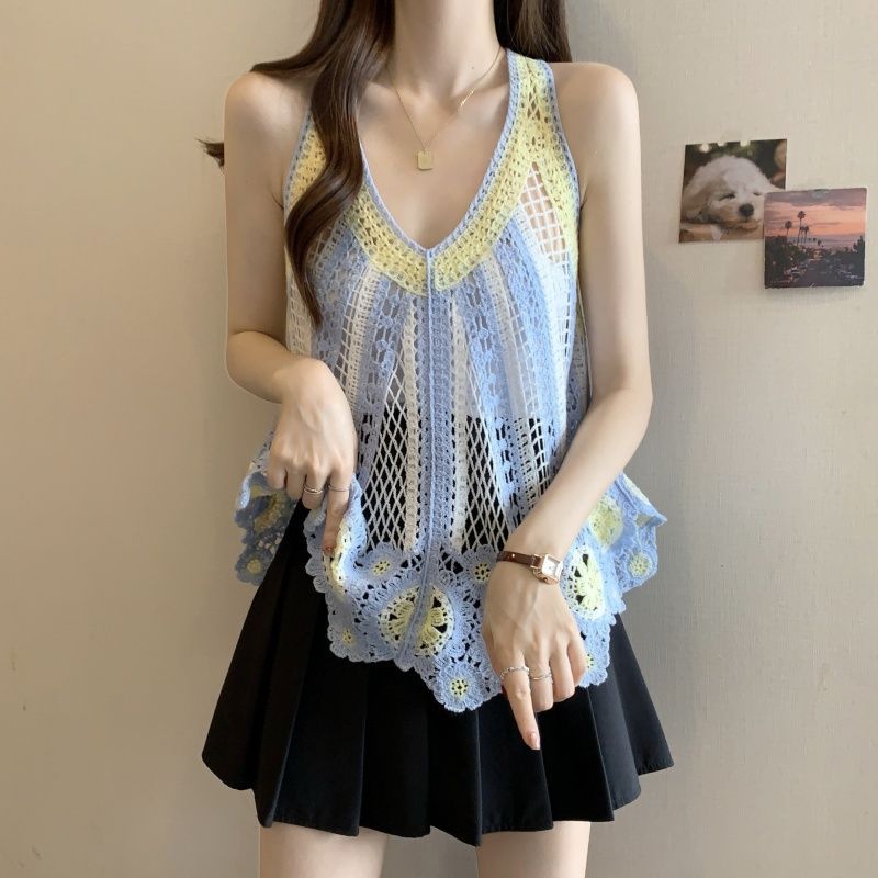 波西米亞設計感撞色可疊穿鏤空吊帶背心