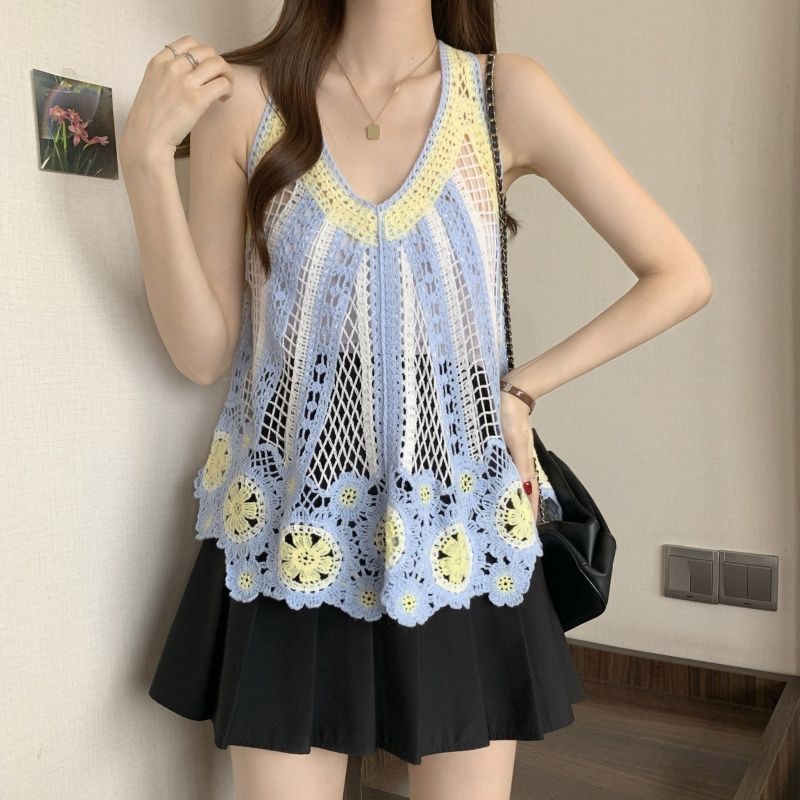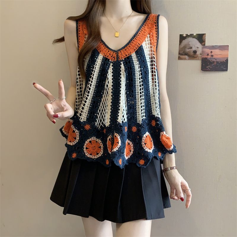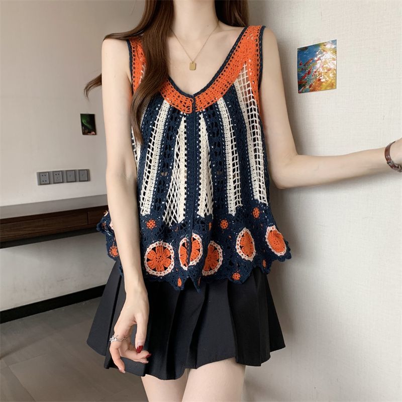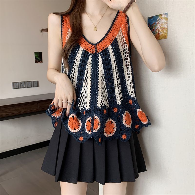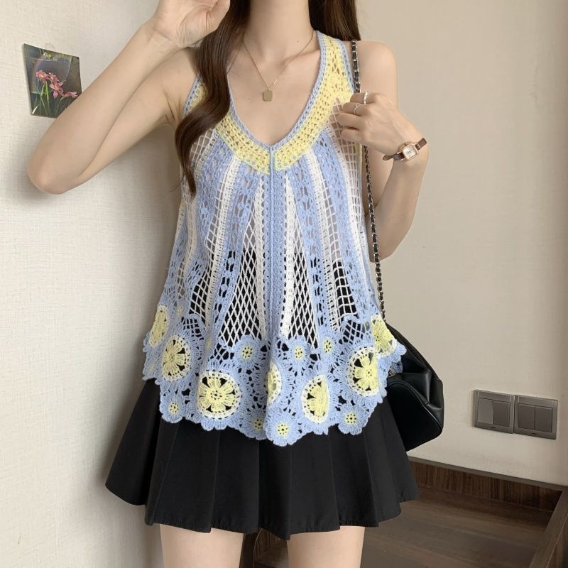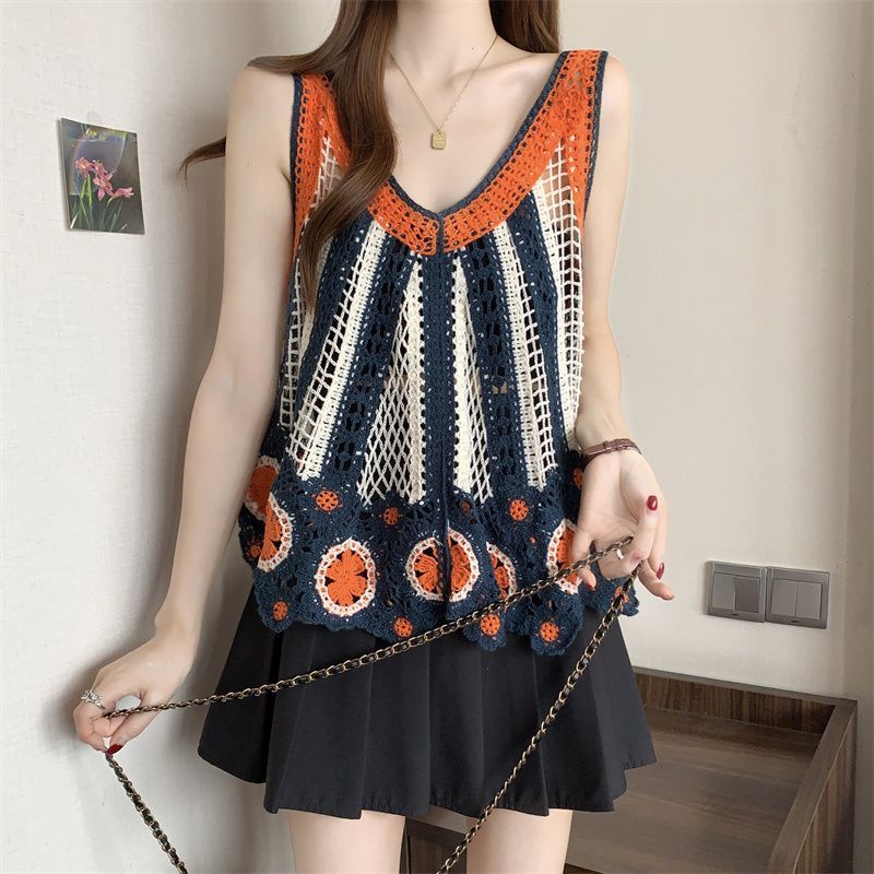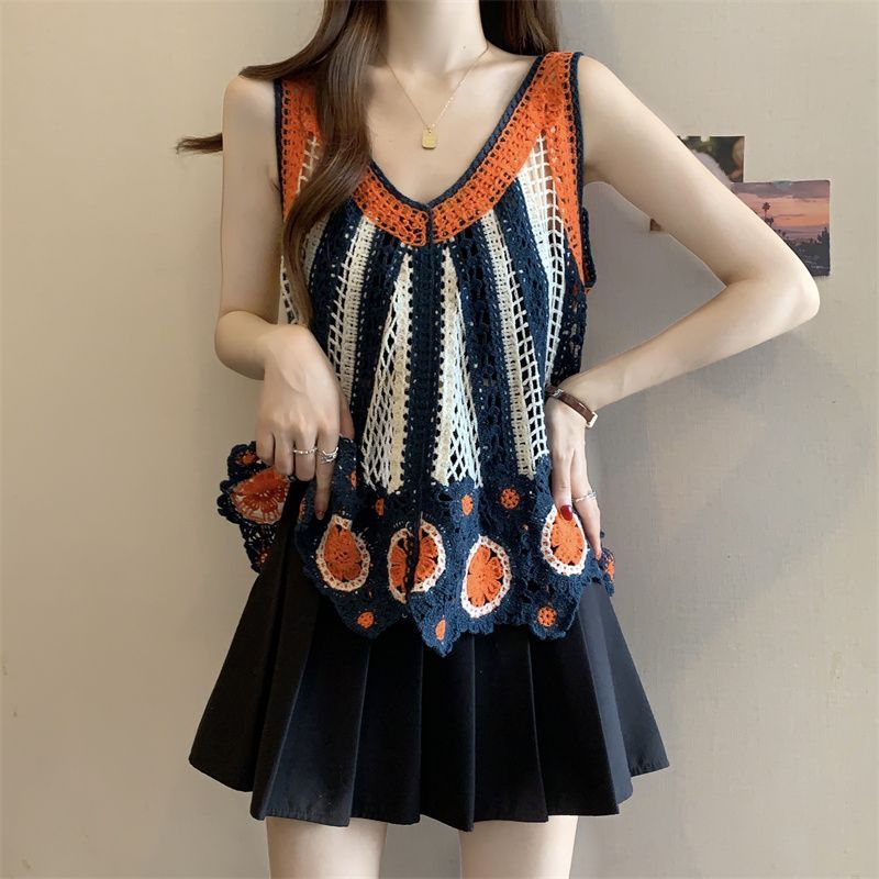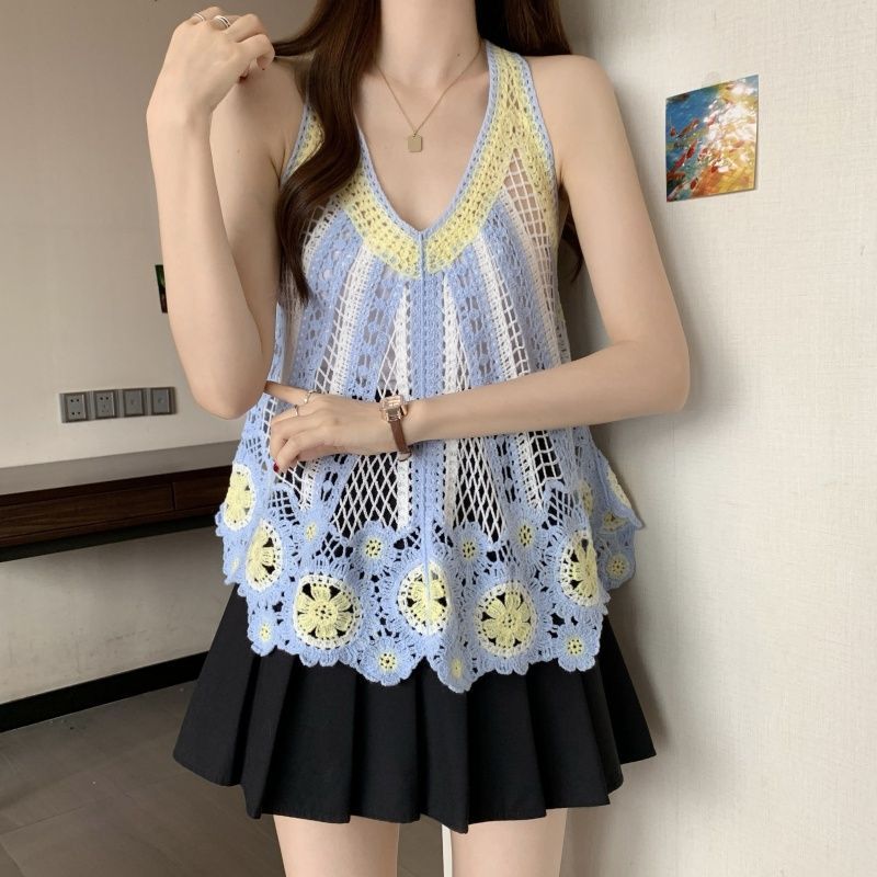 波西米亞設計感撞色可疊穿鏤空吊帶背心