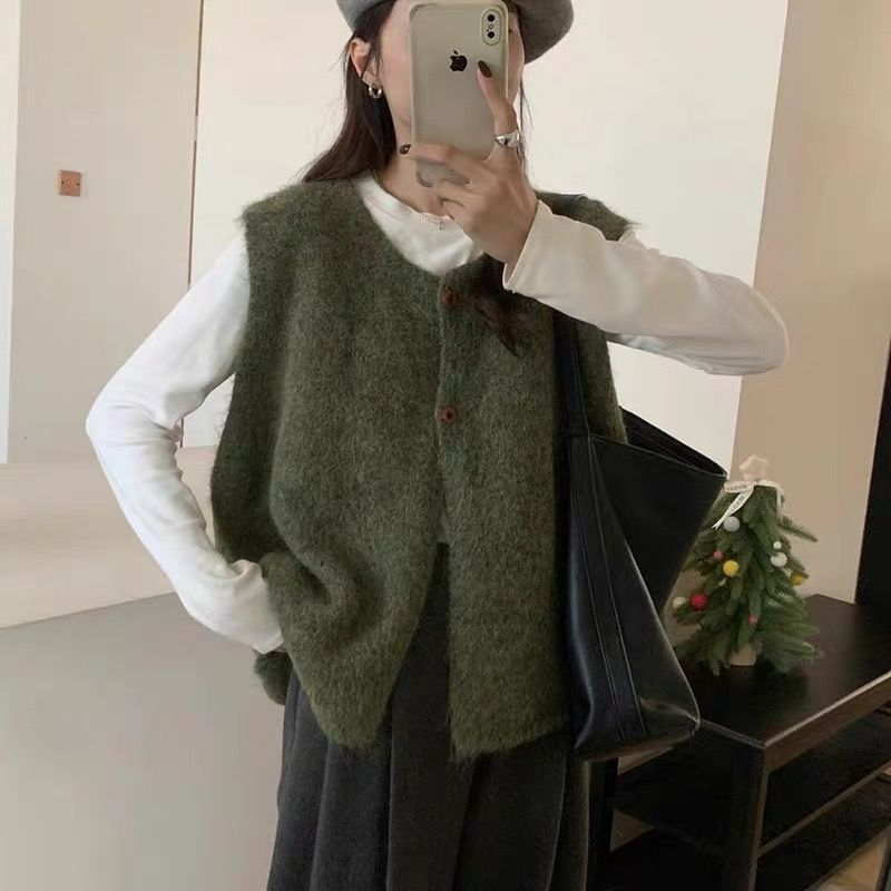 日系復古軟糯圓領坎肩針織馬甲開衫