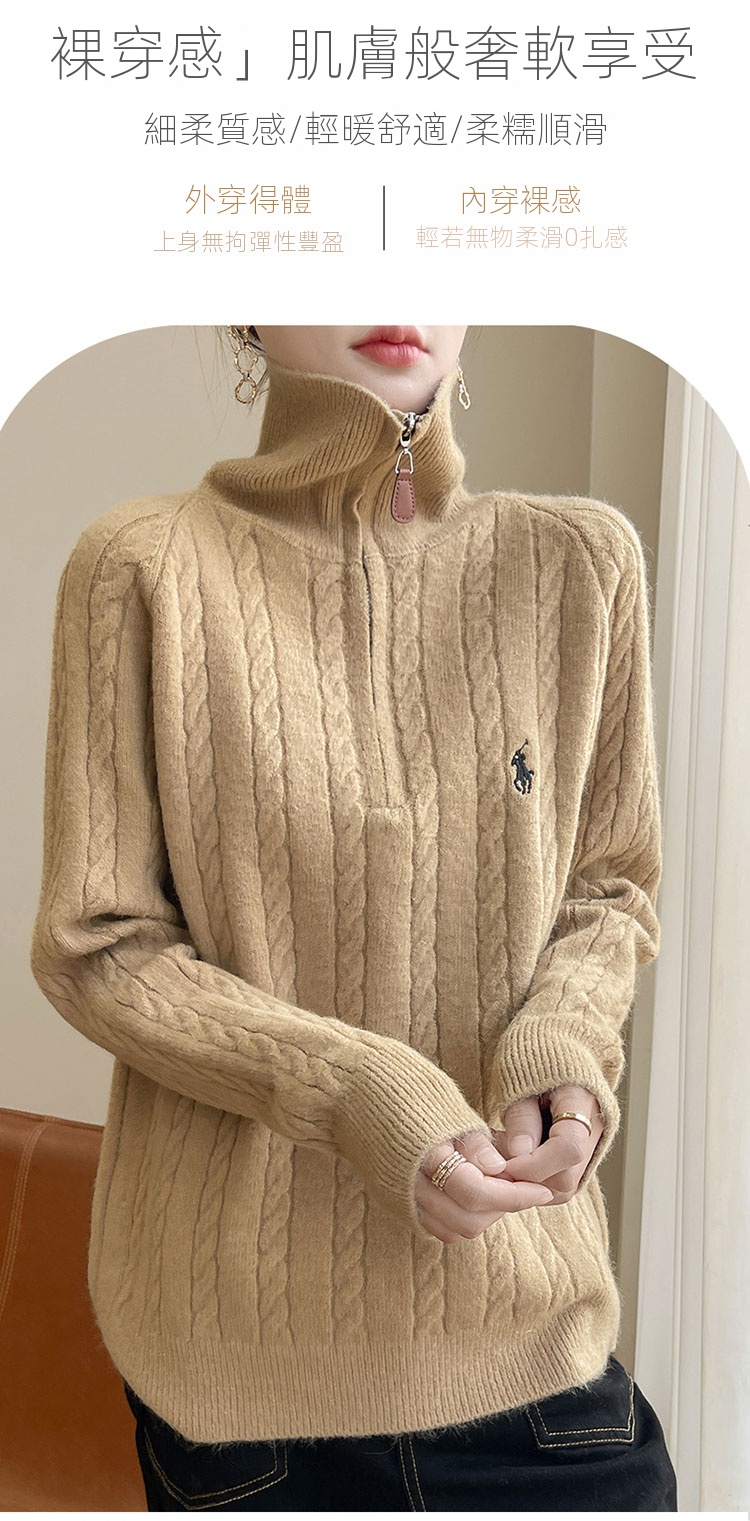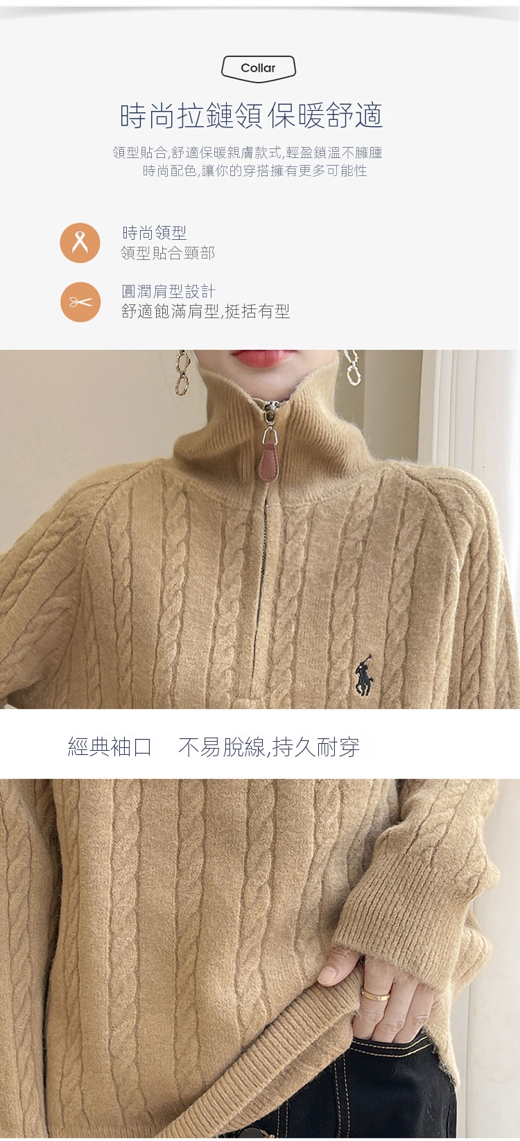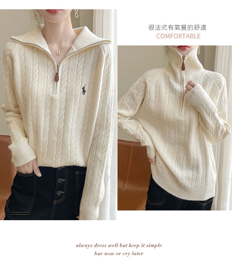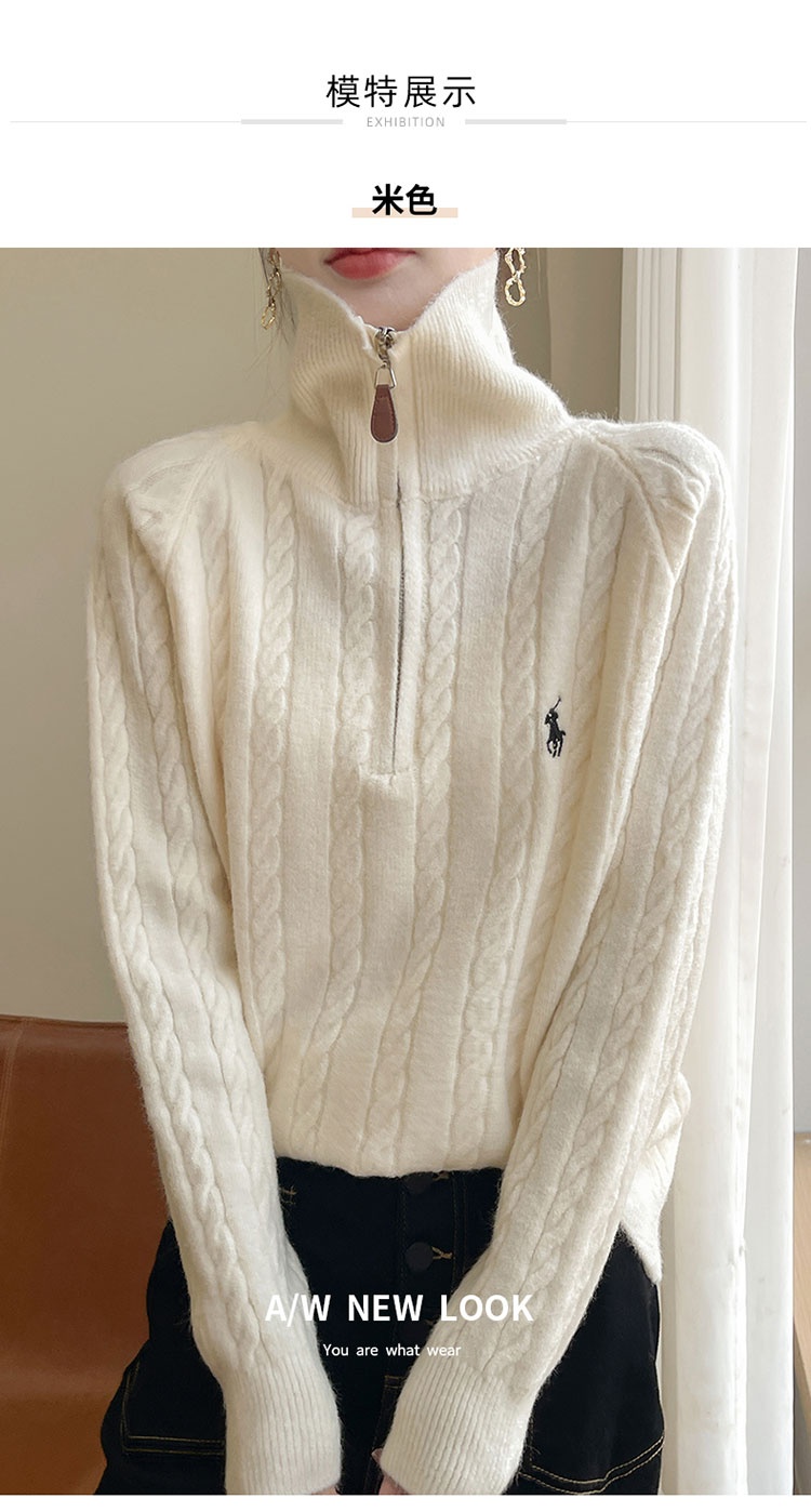 半拉鏈立領寬鬆翻領小馬刺繡針織毛衣