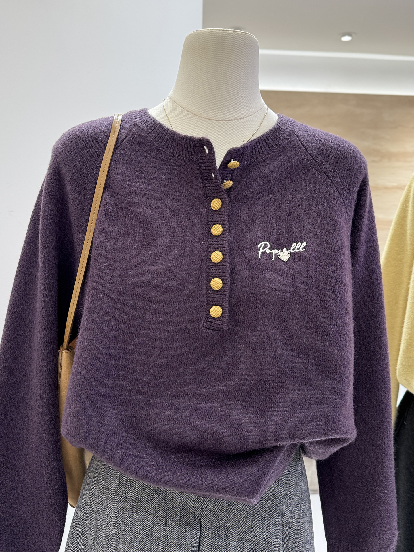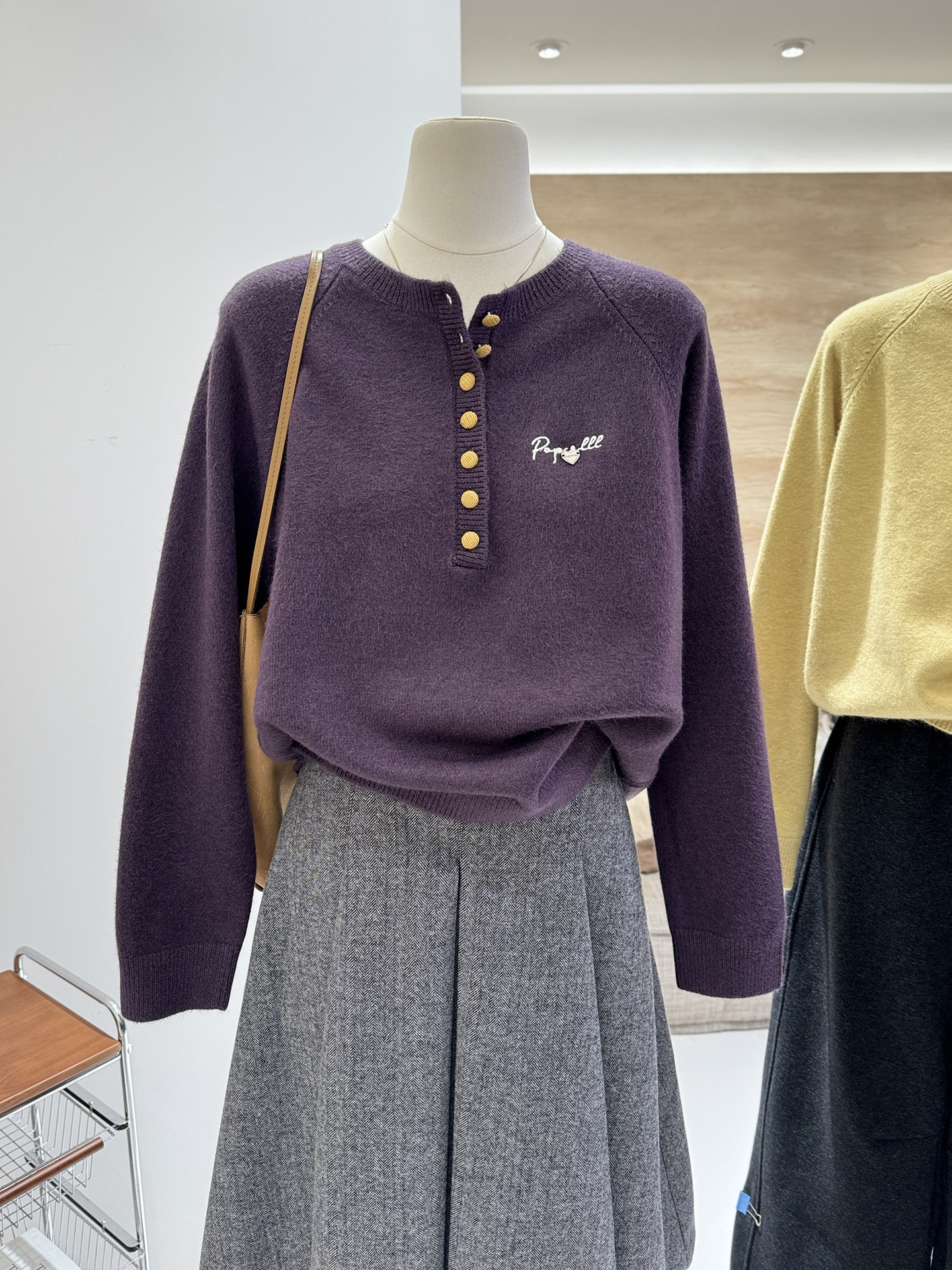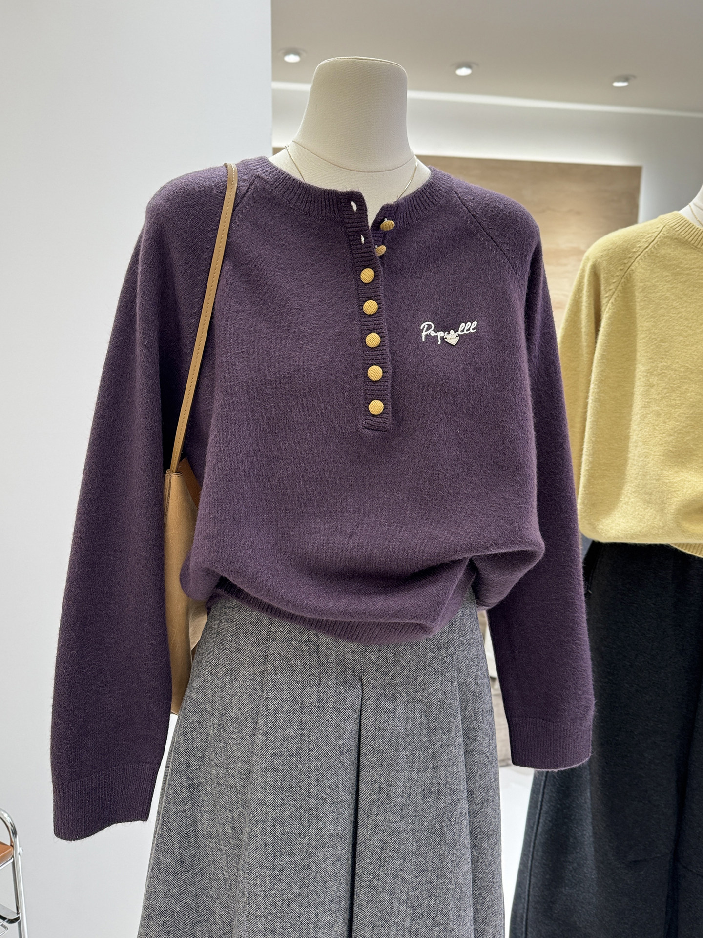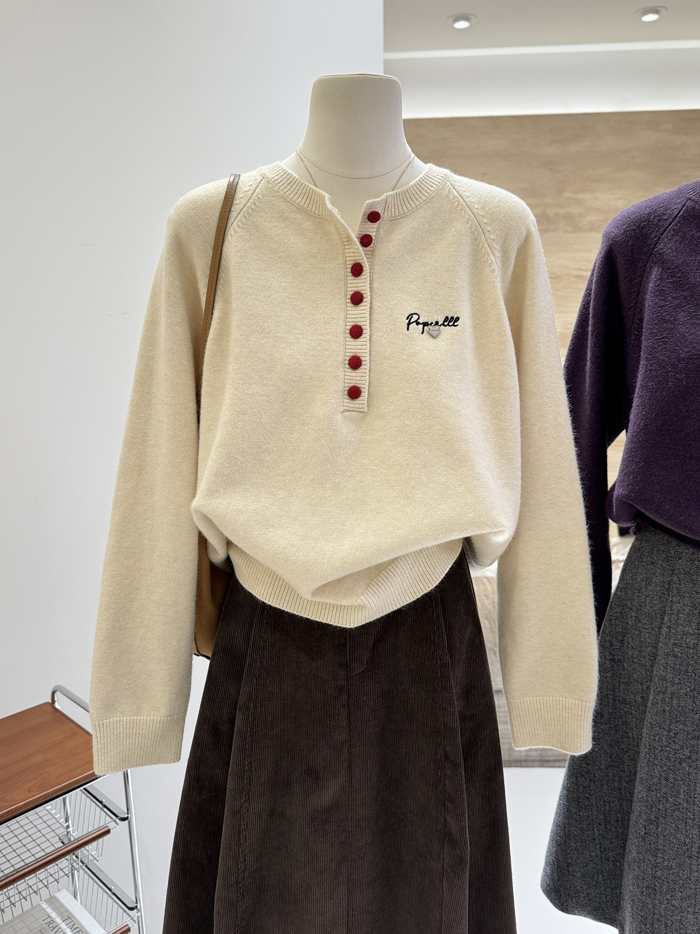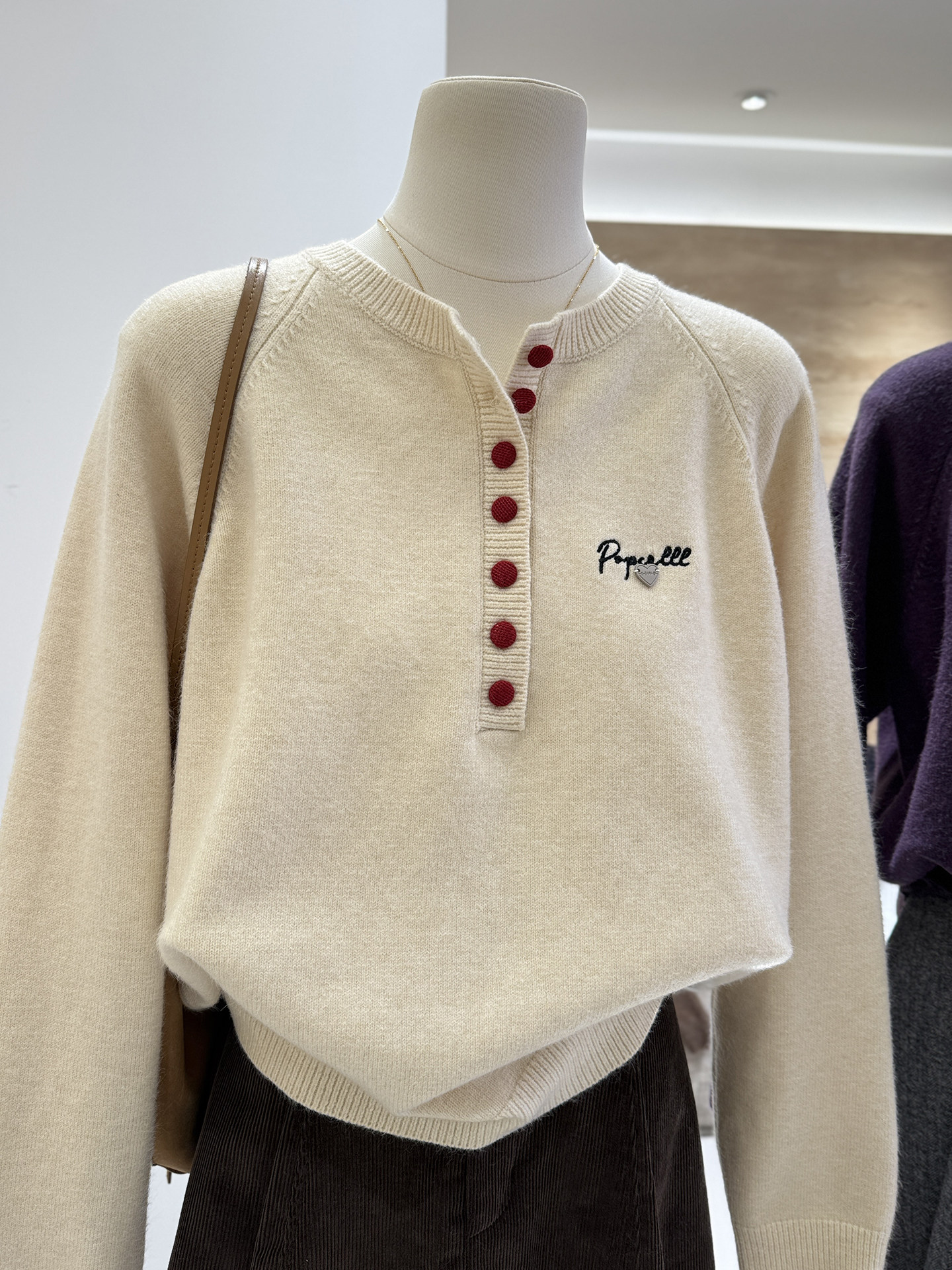 韓系半開領紐扣時尚顯瘦字母刺繡針織毛衣