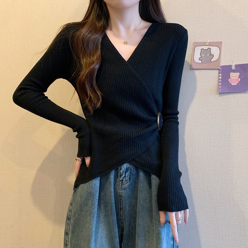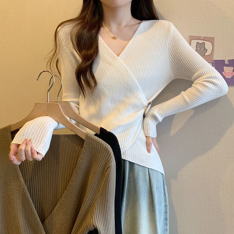 小香風v領坑條寬鬆顯瘦大碼純慾風長袖T恤