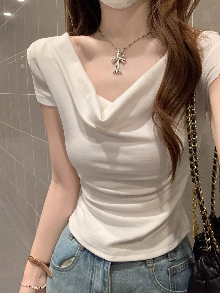超顯瘦百搭氣質鎖骨一字肩蕩領短袖T恤-Cicimode